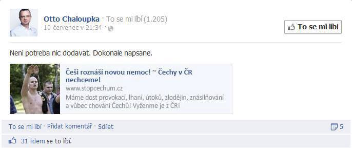 Je tomu tak, že naše hnutí proniká všemi vrstvami společnosti a rezonuje v nich krásnou písní. Někomu její tóny sice neladí, ale pro jiné je zvukem nebeských tónů. Těch, kterým lahodí, je naštěstí víc. A že strháváme další a další - toho důkazem je široká podpora kulturní, občanská i politická! Dalším z našich podporovatelů se stal poslanec Otto Chaloupka.